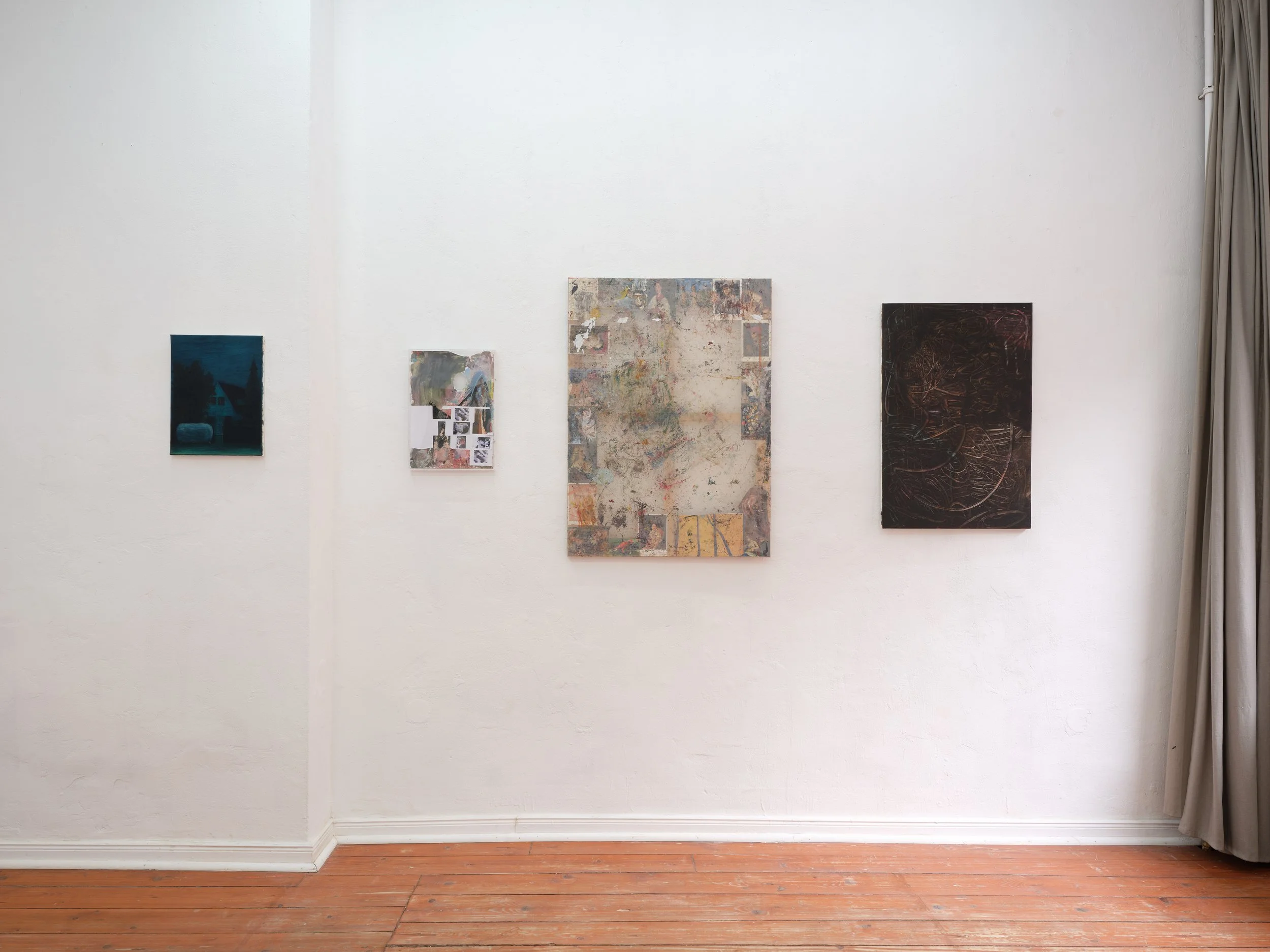 Give Me a Summer Hole (Under the Volcano Part II), 2025, 152 x 100 cm, oil on canvas Untitled #2 (Painter's Palette Series), 2023, 41 x 29.7 x 4 cm, mixed media on painter’s palette, perspex box Frozen References, 2023, 100 x 72 x 2 cm, gesso, postcards, plastic sheet, paint Death in Venice, 2025, 81 x 54 cm, oil on canvas Untitled #3 (Painter's Palette Series), 2023, 41 x 29.7 x 4 cm, mixed media on painter’s palette, perspex box